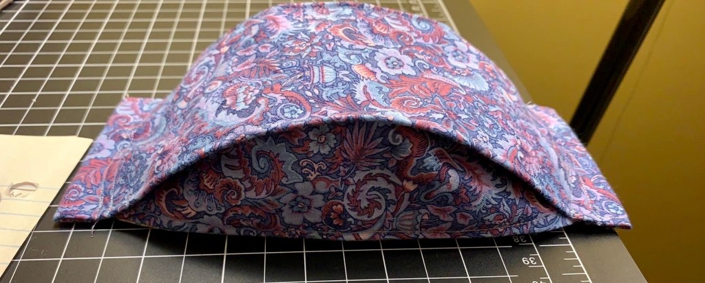 This is my preferred simple pattern. It shapes better to the face than any other simple pattern that I have tried and is light and not bulky. It can only be made with woven fabrics as the crispness is needed for form integrity.