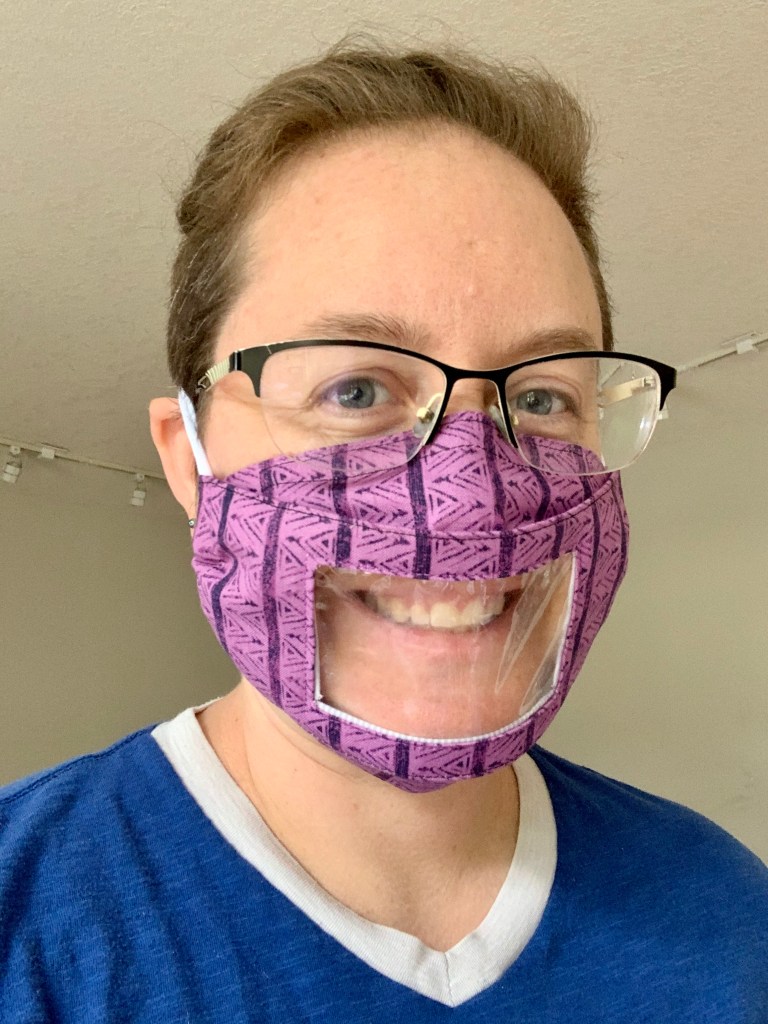 Simple 3D mask with nose wire and transparent window for lip and expression reading. These cost slightly more at $16/mask. Available in large youth/small adult, regular adult, and large adult sizes.